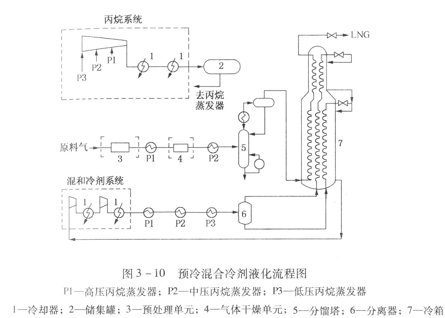 圖3-10[3]。是丙烷預(yù)冷混合制冷劑循環(huán)液化天然氣流程圖。流程由三部分組成:①混合制冷劑循環(huán);②丙烷預(yù)冷循環(huán);③天然氣液化回路。在此液化流程中,丙烷預(yù)冷循環(huán)用于預(yù)冷混合制冷劑和天然氣,而混合制冷劑循環(huán)用于深冷和液化天然氣。