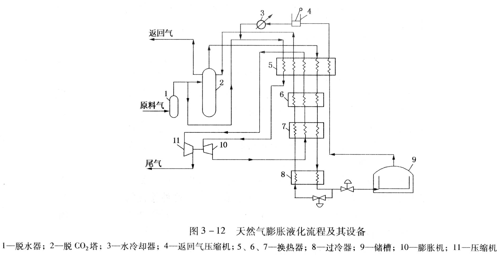 天然氣膨脹液化流程見(jiàn)圖3-12。原料氣經(jīng)脫水器1脫水后,部分進(jìn)入脫CO2塔2進(jìn)行脫除CO2。這部分天然氣脫除CO2后,經(jīng)換熱器5~7及過(guò)冷器8后液化,部分節(jié)流后進(jìn)入儲(chǔ)槽9儲(chǔ)存,另一部分節(jié)流后為換熱器5~7和過(guò)冷器8提供冷量。儲(chǔ)槽9中自蒸發(fā)的氣體,首先為換熱器5提供冷量,再進(jìn)入返回氣壓縮機(jī)4,壓縮并冷卻后與未進(jìn)脫CO2塔的原料氣混合,進(jìn)換熱器5冷卻后,進(jìn)入膨脹機(jī)10膨脹降溫后,為換熱器5-7提供冷量。