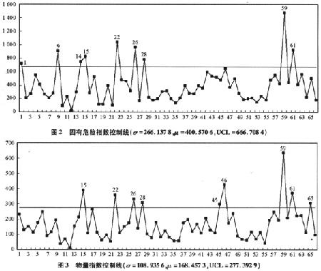 ??? 對于筆者的研究對象,出于安全考慮,樣本參數(shù)都應采取單側(cè)控制策略,即對于固有危險指數(shù)、物量指數(shù)、工藝系數(shù)、設備系數(shù)僅需設置上控制線,而對于安全設施系數(shù)則僅需設置下控制線。這時,只要取μ±σ,就可以對