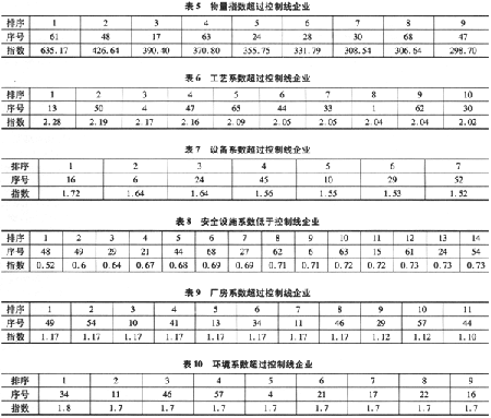 對圖1~圖5中超出控制線的企業進行排序(在此,為便于比較,將廠房系數、環境系數也考慮在內并以其平均值作為控制線),得表4~表10。