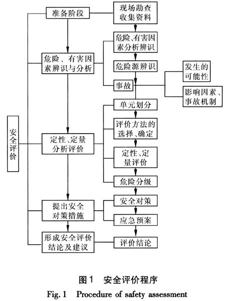 安全評價的基本程序主要包括:準備階段,危險、有害因素辨識與分析,定性、定量分析評價,提出安全對策措施,形成安全評價結論及建議[1]。安全評價程序見圖1。