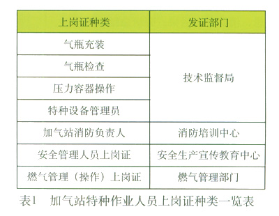 根據(jù)國家相關(guān)法律法規(guī)要求,加氣站特種作業(yè)人員還必須做到持證上崗,應取得的上崗證及發(fā)證部門見表1。