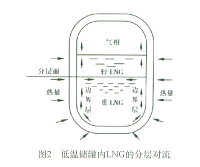 渦旋主要是由于在向盛有LNG的低溫儲罐中充注新的LNG液體或者LNG中氮蒸發(fā)而使儲罐內(nèi)的液體發(fā)生分層。分層液體在儲罐周邊漏熱的作用下,形成各自獨立的自然對流循環(huán),進而使各層液體的密度不斷發(fā)生變化,見圖2。當相鄰兩層液體的密度近似相等時,兩個液層就會發(fā)生強烈混合,下層積聚的熱量突然釋放出來,同時伴隨著LNG表面蒸發(fā)率的驟增,幾乎可達到正常情況下蒸發(fā)率的250倍。蒸發(fā)產(chǎn)生的大量氣體,引起儲罐內(nèi)壓力突然增大,導致大量天然氣排空,造成嚴重浪費,甚至可能毀壞儲罐及工藝系統(tǒng),引起爆炸或火災,嚴重威脅人員和財產(chǎn)安全。