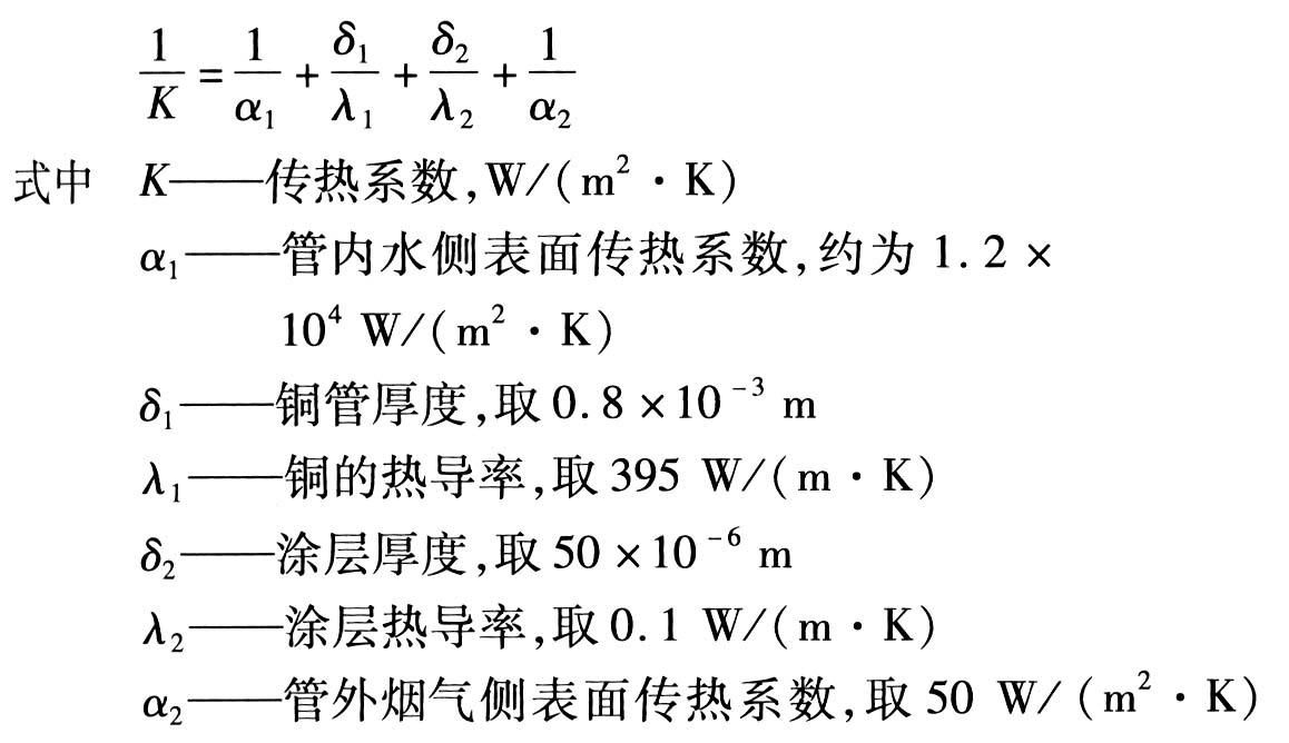 ? ??曾有人擔心防腐涂料的導熱性能很差,其熱導率為0.1~0.2 W/( m·K),僅為紫銅的0.4%,是否會明顯減弱換熱器的換熱性能。下面用一個簡單的例子來說明。煙氣流經銅水管(帶涂層)時的傳熱系數K可以表示為: