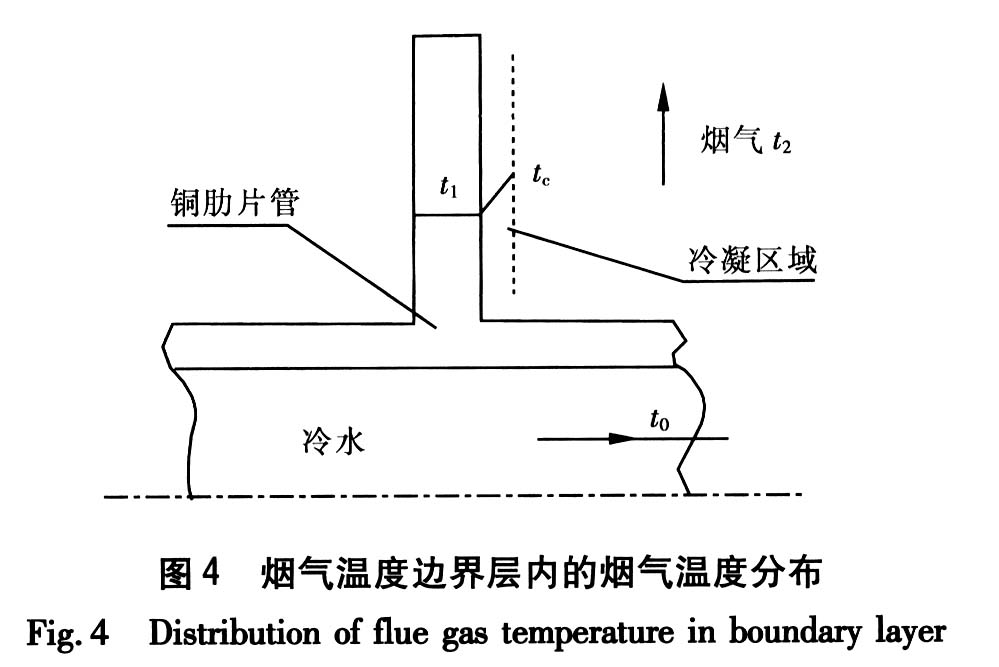煙氣沿肋片表面流動過程中,在臨近肋片表面存在一個溫度邊界層。在邊界層內,與肋片表面直接接觸的位置上煙氣溫度與肋片表面溫度相同,為t1,見圖4;離開肋片表面,煙氣溫度逐漸升高,最后達到最高值t2。假定水溫明顯低于露點而煙氣溫度又較低,則在煙氣邊界層內便會存在一個冷凝區域,其內煙氣溫度處于露點tc以下。相應在此冷凝區域內水蒸氣便冷凝成水霧,并貼附在肋片表面,出現冷凝水。因此,冷凝水生成的條件應是肋片表面溫度低于煙氣露點(存在冷凝區域),即t1<tc。應注意肋片不同位置上的表面溫度不相同。對冷凝區域大小影響最大的兩個因素,一是冷水溫度t0,二是煙氣溫度t2。冷水溫度越低,冷凝區域越大;煙氣溫度越低,冷凝區域越大。