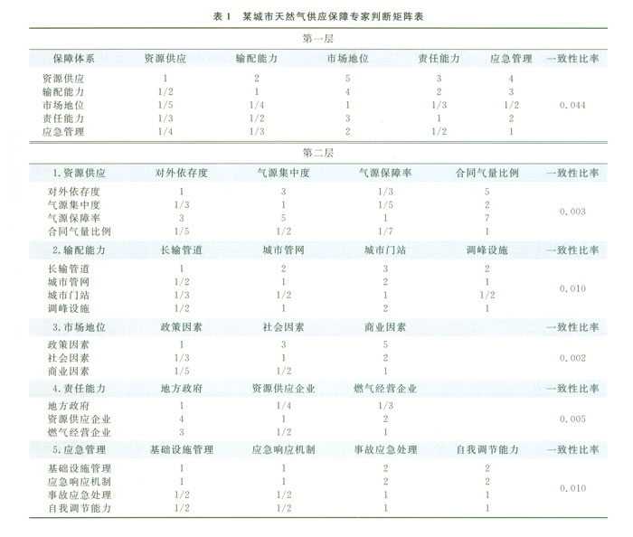 首先邀請天然氣行業l0余名專家針對天然氣供應保障評價指標體系內l8個評價指標逐一判斷其相對重要程度,構造判斷矩陣(表1)。