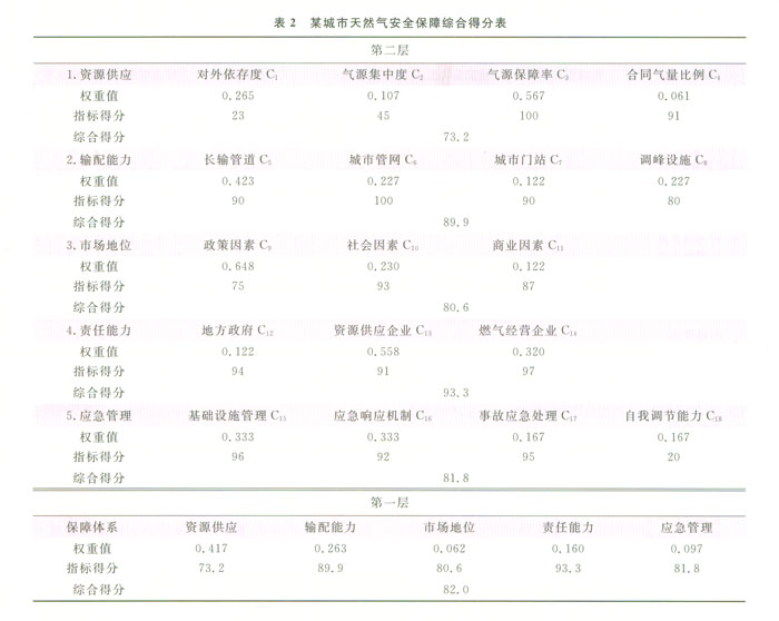 基于上述判斷矩陣,計算某城市的天然氣供應保障模型綜合得分,綜合得分是指各項評價指標得分與權重值的加權求和,得到該城市的綜合得分為82.0分,計算結果見表2。