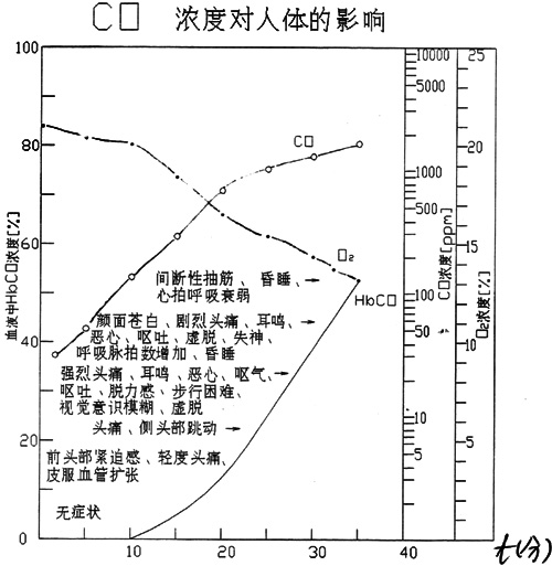 假如人的神經組織一旦被破壞,醫學將無能為力,中毒者將成為植物人。CO濃度對人體的影響是這樣的(見下圖):