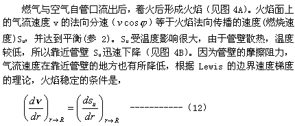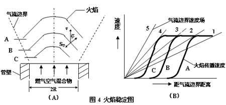 ??? 由圖4可見,當(dāng)氣流速度為線2時(shí),火焰穩(wěn)定在A平面。當(dāng)氣流速度逐漸增加時(shí),火焰可以穩(wěn)定在B或C平面上。如果氣流速度增加至5時(shí),由于射流作用,沿氣流邊界會(huì)混入過(guò)多的空氣,使Su下降,火焰得不到平衡的位置,火焰脫離管口,發(fā)生脫火現(xiàn)象。相反當(dāng)氣流速度下降,達(dá)到線1時(shí),火焰可以進(jìn)入管內(nèi),發(fā)生回火現(xiàn)象。