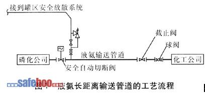 ????本項目在液氨長距離輸送管道的起點磷化公司廠區(qū)內(nèi)設(shè)置球閥1個,且為了保證出廠壓力及預防管道破損等事故,安裝了安全自動切斷閥1個,閥后設(shè)安全放散閥組1套,連接到廠區(qū)罐區(qū)內(nèi)的安全放散系統(tǒng);為控制管道的末端壓力,且為保證將來檢修方便,在終點化工公司廠區(qū)內(nèi)設(shè)置截止閥和球閥各1個。工藝流程見圖1。