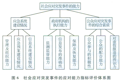 3)應對體系的脆弱性也是影響事件擴散的重要原因之一,脆弱性越強,應急能力及社會抵抗能力就越差,一般的安全突發(fā)事件就越容易擴散成為重大安全突發(fā)事件。對應對體系的控制管理也可以通過建立指標評價體系進行指標分析,挖掘影響應對體系的主要因素并進行有效的控制,如此可以降低應對體系的脆弱性。結合政府機構及民眾的參與程度建立社會應對突發(fā)事件的指標評價體系如圖6所示。