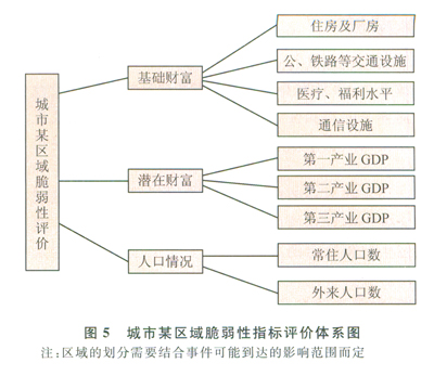 如圖6所示,城市某一地區(qū)一旦發(fā)生油罐爆炸等突發(fā)事件,承災對象則是城市該區(qū)域的財富及居民,其中城市的財富包含基礎財富和潛在的財富,突發(fā)事件爆發(fā)后,這些對象都將會受到事件的沖擊,對象的脆弱性大小基本決定著損失大小。因此,在油罐、加油站等建設的選址時,首先需要對其周邊的脆弱性進行評價,然后選取脆弱性最低的區(qū)域,如此可以有效地降低損失。