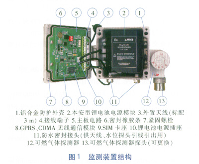 基于燃氣泄漏監(jiān)測解決方案,我們設(shè)計了監(jiān)測裝置,結(jié)構(gòu)見圖1。監(jiān)測裝置采用本質(zhì)安全鋰電池供電,外殼防護等級為IP65,防爆等級為ExibmbdIIBT4,無線發(fā)射功率小于2W,支持GPRS、CDMA無線網(wǎng)絡(luò),體積小、重量輕、安裝方便。對于安裝在閥門井中的監(jiān)測裝置,天線經(jīng)防水密封接頭從監(jiān)測裝置引出后,沿井壁安裝,天線最高點位于井蓋下方。若信號強度較弱,可用套管從井壁將天線引至井蓋旁接近地面處,地面采用水泥修復(fù)。對于安裝在調(diào)壓箱中的監(jiān)測裝置,天線可不從調(diào)壓箱引出。