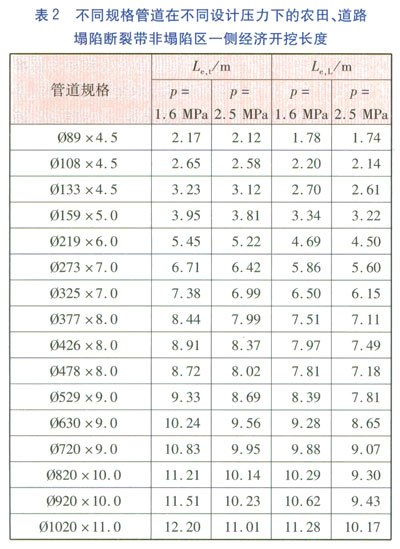 采用前面計算方法,分別計算出農田、道路塌陷區對應的上,并將表1數據代入式(16),可計算得不同規格管道在不同設計壓力下農田、道路塌陷斷裂帶非塌陷區一側經濟開挖長度Le,t、Le,L,見表2。