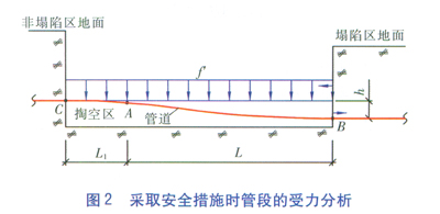 當塌陷區接近或達到允許沉降量時,點A處的管道將出現失穩,必須采取安全措施降低當量應力。安全措施的具體方法為:將管段AB上方的覆土挖走,將土壤荷載卸載。再從點A向塌陷斷裂帶非塌陷區一側開挖一段距離到達點C,并將管段翻下部掏空,以緩解管段AB的彎曲變形,以便較好地應對下一次沉降,將管段下部懸空部分填實后回填至沉降后地面高度。在實際操作中我們關心的是如何確定塌陷斷裂帶非塌陷區一側開挖長度。采取安全措施時管段的受力分析見圖2。