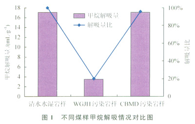 WGJH鉆井液幾乎不具降解性能,其黏度較高,流動性較差,滲透率恢復(fù)率低,因此,侵入煤層后很難從煤層中返排出來,煤層滲流通道處于堵塞狀態(tài),解吸能力易受到影響。此外,鉆井液中的高分子聚合物,像致密膜一樣包裹和吸附于煤巖表面,阻礙了煤層甲烷的解吸。