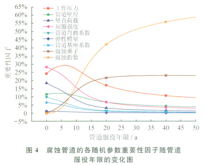 1)在城市埋地燃氣輸配管道投入運行初期,腐蝕對管道失效概率的影響較小,而其余隨機參數對管道失效概率的相對影響隨工作壓力大小而變化,當工作壓力小于2.5MPa時,豎直荷載是影響管道失效概率的主要因素,其次是材料屈服強度、管道彎曲系數等,工作壓力對失效概率的影響很小;隨著工作壓力的增加,豎直荷載、管道彎曲系數對失效概率的重要性逐漸下降,材料屈服強度、管道壁厚的重要性逐漸增加,而工作壓力的重要性顯著增加;當工作壓力達到4.0MPa時,對管道失效概率影響較大的兇素依次是材料屈服強度、工作壓力、豎直荷載和管道壁厚等。