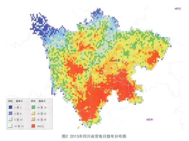 2013年四川省閃電密度最高的區(qū)域主要出現(xiàn)在鹽邊、兩昌、德昌、普格、名山、南江、旺蒼、開江、合江等縣以及綿陽、涼山、宜賓、成都、廣元和資陽大部分區(qū)域,最大值為50.68次/年·平方公里。雷電日數(shù)出現(xiàn)較多的主要在攀枝花、涼山、甘孜、阿壩、廣安、宜賓、內(nèi)江、自貢、樂山等市州[3]。