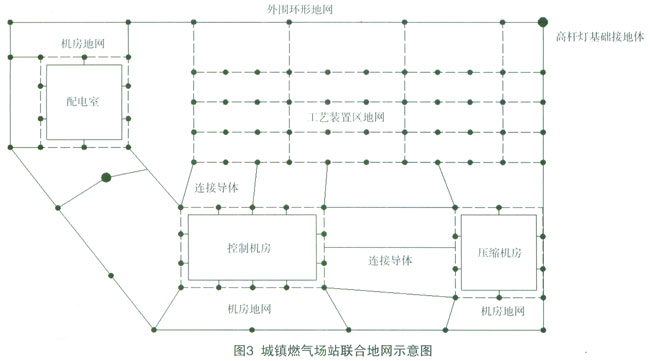 聯(lián)合地網(wǎng)是將城鎮(zhèn)燃?xì)鈭稣緝?nèi)各建筑物的基礎(chǔ)接地體和其他管道設(shè)施的專設(shè)接地體用水平接地體相互連通形成一個共用地網(wǎng),建筑物防雷接地和室內(nèi)接地系統(tǒng)均由一個共用地網(wǎng)引出,室內(nèi)電子設(shè)備的保護(hù)接地、邏輯接地、屏蔽體接地、防靜電接地等均共用一組接地系統(tǒng)[8][9](如圖3所示)。