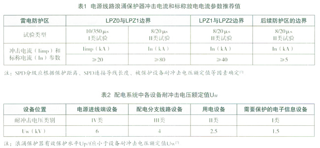 對于交流精細保護設備及直流設備,應該根據設備自身構造,結合其安裝位置等,確定更多防護等級,設置相應通流容量及限壓水平的浪涌保護器。(具體見表1、表2)