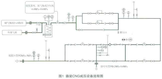 撬裝CNG減壓設備采用3N減壓形式,其中二級減壓后預留中壓出口1個,出口壓力為0.2MPa~0.4MPa;三級減壓后預留低壓出口1個,出口壓力為2kPa~5kPa。見圖1。