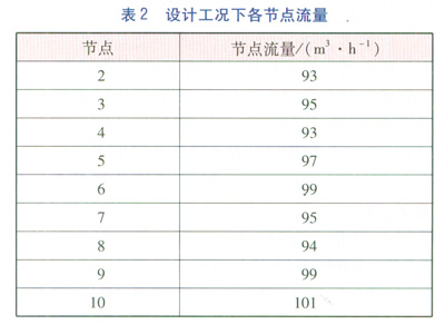 某小型環狀管網由1個熱源,13段管段,10個節點和4個環組成。我們認為泄漏發生在節點處,若不考慮參考節點(算例中選取熱源定壓作為參考節點,定壓水頭為94.65m),那么存在9個可能泄漏的位置(節點2~10),時間步長取1s,泄漏面積取0.001m2。環狀管網結構見圖1。各管段長度、公稱直徑見表1,設計工況下各節點流量見表2。