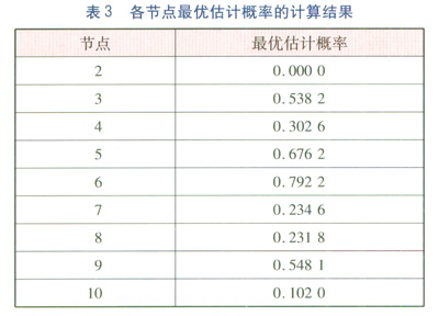 在節點6施加0.001m2的泄漏面積,利用MATLAB語言編程對熱網泄漏工況水力模型進行求解,規定激勵施加持續的時間t¢為400s,慢變指數啟為1。可以得到水頭監測點、流量監測點的400組水頭與流量的測量值,并作為真實值代入預測誤差模型,進而計算各節點預計結果的最優估計概率。由于節點泄漏數據庫數據的精度問題以及模型誤差等問題,最優估計概率最大的節點不一定是真實的泄漏節點,因此我們設定一個閾值0.5,認為最優估計概率大于或等于0.5的節點可能是泄漏節點。各節點最優估計概率的計算結果見表3。
