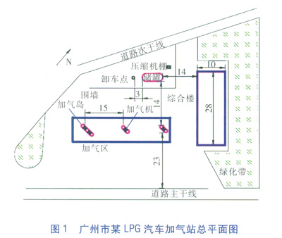 加氣區設有3個加氣島,加氣島寬度為1.2m,靠站區西南側的一個加氣島設置有2臺6槍加氣機,其余兩個加氣島各設置1臺6槍加氣機。加氣機與綜合樓的最小距離為14m,與東面道路主干線邊沿的距離為23m;此外,該LPG加氣站周邊100m范圍內沒有學校、醫院、幼兒園和其他黿要公共設施。