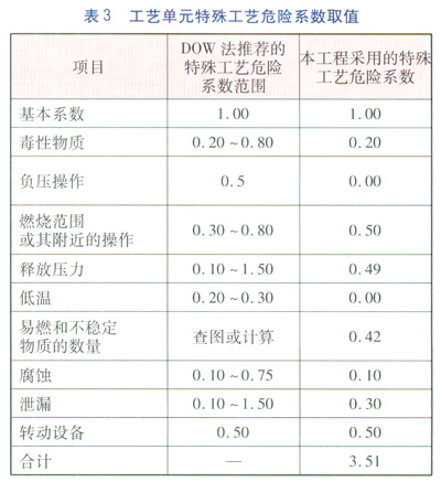 (11)本工藝單元的特殊工藝危險(xiǎn)系數(shù)取值見表3。特殊工藝危險(xiǎn)系數(shù)F2等于表3中采用的所有危險(xiǎn)系數(shù)之和,計(jì)算得F2=3.51。