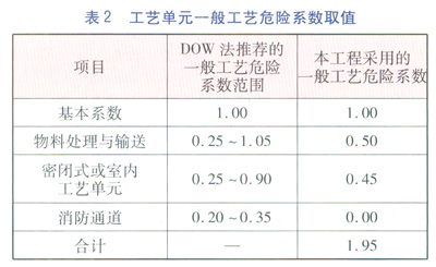 ⑤本工藝單元的一般工藝危險(xiǎn)系數(shù)取值見表2。一般工藝危險(xiǎn)系數(shù)F1等于表2中采用的所有一般工藝危險(xiǎn)系數(shù)之和,計(jì)算得F1=1.95。