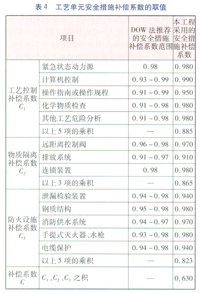 本工藝單元的安全措施補(bǔ)償系數(shù)的取值詳見表4。