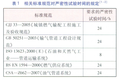 表1列出了相關標準規范對嚴密性試驗時間的規定[1-2]。由表1可以看出,不同標準規范對嚴密性試驗所規定的時間差異較大。