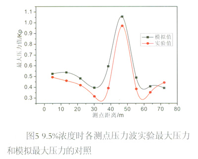 從圖5中不難看出壓力波的模擬結(jié)果與實(shí)驗(yàn)結(jié)果存在一定差異。模擬值在10m至50m范圍以及55m至65m范圍內(nèi)要明顯大于實(shí)驗(yàn)值,可能與模擬時(shí)壁面條件的設(shè)定有關(guān),數(shù)值模擬中壁面設(shè)定為光滑,而實(shí)際管道的壁面粗糙,因此天然氣燃爆傳播過程中損耗了部分能量,使得壓力值有所降低。而在出口附近模擬值逐漸降低,這與實(shí)驗(yàn)值逐漸升高的趨勢(shì)正好相反,這是由于實(shí)驗(yàn)中在出口處進(jìn)行了封膜處理,這就對(duì)出口附近的壓力波造成擾動(dòng),使得壓力值升高,而模擬中出口處沒有做任何處理,因此泄壓后壓力值是降低的。若從曲線的變化趨勢(shì)來看,管道天然氣燃爆時(shí)壓力波最大壓力值都是在爆源點(diǎn)附近先降低,然后上升到某一峰值再逐漸衰減。