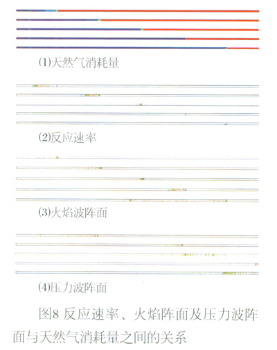 用Fluent模擬出了隨著管道內(nèi)天然氣的逐漸消耗,其對(duì)應(yīng)的反應(yīng)速率、火焰陣面以及壓力波陣面的變化趨勢(shì),這是實(shí)驗(yàn)時(shí)無法觀測(cè)到的,如圖8所示:
