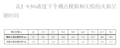 表2為濃度9.5%的管道天然氣燃爆數(shù)值模擬結(jié)果得出的火焰在各測(cè)點(diǎn)呈現(xiàn)時(shí)間,并與實(shí)驗(yàn)得出的火焰呈現(xiàn)時(shí)間進(jìn)行比較。