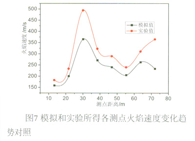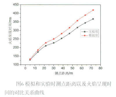 從圖6中可以看出模擬時(shí)和實(shí)驗(yàn)時(shí)測(cè)點(diǎn)距離和火焰呈現(xiàn)時(shí)間的關(guān)系是一致的,都是隨著距離的加大,火焰呈現(xiàn)時(shí)間單調(diào)遞增,但是值得注意的是模擬的各測(cè)點(diǎn)火焰呈現(xiàn)時(shí)間要比實(shí)驗(yàn)時(shí)火焰呈現(xiàn)時(shí)間長,這可能與管壁的粗糙程度有關(guān)系。