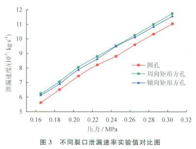 圖3為圓孔、周向矩形方孔、軸向矩形方孔的泄漏速率實驗值對比。由圖3可以看出,對于圓孔、周向矩形方孔、軸向矩形方孔,管內壓力增大時泄漏速率隨之增加,呈近似線性關系,因為氣體通過孔流出的過程可假定為等熵膨脹,孔口面積一定,隨著管內壓力增大,更多的壓力能轉化為氣體的動能,泄漏速率隨之增加。相同的管內壓力下,矩形方孔的泄漏速率顯著高于圓孔,從實驗數據來看,裂口方向對泄漏速率的影響不顯著,壓力為0.245MPa時,周向矩形方孔與軸向矩形方孔泄漏速率的差值僅為0.0323×10-3kg/s,但總體上,相同的管內壓力下,周向矩形方孔泄漏速率略高于軸向矩形方孔。
