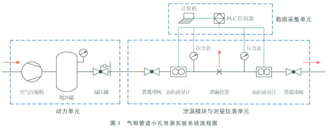 圖1為氣相管道小孔泄漏實驗系統流程圖,系統主要由動力單元、泄漏模塊與測量儀表單元、數據采集單元組成。其中: