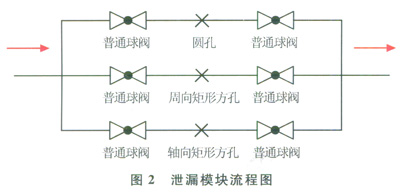 設計并加工一套可拆卸更換的泄漏模塊,即3根并聯連接的管道,每根管道長1.2m,在管道頂部開圓孔和矩形方孔,圓孔和矩形方孔具有等水力半徑的幾何特征,矩形方孔的長邊沿周向或軸向分布,通過閥門切換管道模擬不同裂口形狀及方向的泄漏過程。圓孔孔徑為5mm,主要參照《基于風險的檢驗》(API?581—2008)關于小孔泄漏孔徑的推薦范圍。圖2為泄漏模塊流程圖。