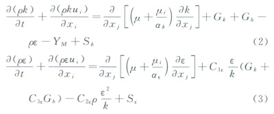 湍流模型采用標準k-e雙方程模型,具有較高的適用性和精度。標準k-e雙方程模型假定湍動黏度是各向同性的,基本輸運方程為:
