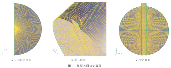 模擬區域為半徑0.6m,高3m的圓柱形區域,管道長1.2m,內徑50mm,壁厚3.5mm,在管道中心處分別開圓孔、周向矩形方孔和軸向矩形方孔,具體尺度與相似實驗相同。考慮到管道長度較短,認為在靜風條件下管道內外流場具有軸對稱的性質,因此對管道及模擬區域進行簡化。網格采用六面體單元、結構化非均勻劃分方法,為準確描述泄漏孔口附近的流場特征,對泄漏孔口附近的網格進行局部加密,網格數為60×104,模型及網格如圖4所示。