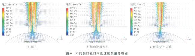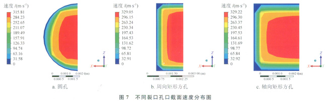 圖6、7分別為出口壓力0.101MPa、入口壓力0.205MPa下不同裂口孔口附近速度矢量分布及截面速度分布。從圖6可以看出,由于膨脹作用,氣體的壓力能轉化為動能,擴散速度急劇增加,在孔口附近可以觀察到由于噴出氣體的高速運動而形成的負壓效應,即周圍大氣以較低的速度向孔口運動的現象[12]。從圖7可以看出,孔口截面速度呈環形分布,最大速度位于孔口中心區域,靠近壁面的過程中,速度不斷減小直至為零,這主要是因為壁面為無滑移邊界,切向速度為零。圓孔、周向矩形方孔、軸向矩形方孔的最大速度分別為315.81m/s、329.05m/s、329.22m/s,即相同管內壓力下,矩形方孔的最大速度明顯高于圓孔,而裂口方向對速度分布的影響不顯著。