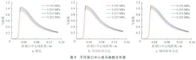 由此可見,圓孔和矩形方孔的臨界壓力比均小于理論值,這主要是因為計算過程中考慮了孔口處的摩擦損失[14]。對比圖8-b、c可知,周向矩形方孔、軸向矩形方孔中心線馬赫數分布基本重合,說明裂口方向對中心線馬赫數分布的影響不顯著。