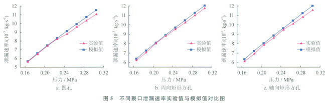 1)對于小孔泄漏,泄漏速率與管內壓力呈近似正相關;管內壓力一定,矩形方孑L的泄漏速率明顯高于圓孔,而裂口方向對泄漏速率的影響不顯著。