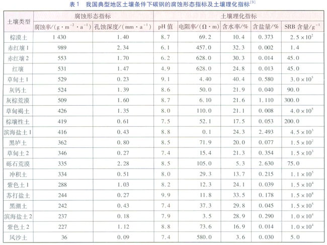 我國典型地區土壤條件下碳鋼的腐蝕形態指標及土壤理化指標見表1[9]。