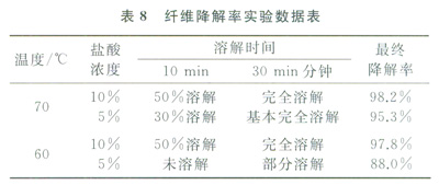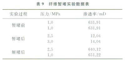 通過(guò)試驗(yàn)數(shù)據(jù)(表8)可以看到,在60℃以上,纖維在鹽酸中能夠很好地降解。暫堵后,纖維能夠顯著降低巖心的滲透率,通過(guò)酸化解堵,巖心滲透率能夠完全恢復(fù)(表9)。