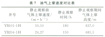 元壩氣田在YB101-1H、YB204-1H井投產(chǎn)中進(jìn)行了試驗(yàn),在YB101-1H靜止觀察前測(cè)得氣體上竄速度為10.1m/h,靜止觀察180h后,氣體上移距離837m;在YB204-1H井中靜止觀察前測(cè)得氣體上竄速度為24.27m/h,靜止觀察150h后,氣體上移距離685.5m,氣體上竄速度均沒(méi)有明顯增加,驗(yàn)證了氣體在壓井液中的運(yùn)行規(guī)律(表7)。實(shí)踐證明,通過(guò)短起下測(cè)油氣上竄速度能夠滿(mǎn)足下完井投產(chǎn)管柱的井控需要。