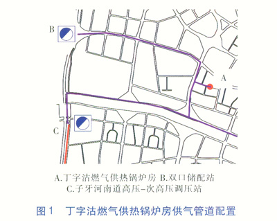根據(jù)天津市現(xiàn)有燃?xì)夤芫W(wǎng)情況,鍋爐煤改氣工程需要沿外環(huán)線新建、擴(kuò)建高壓調(diào)壓站(包括高—次高壓、高—中壓調(diào)壓站)24座。對于距離高壓—次高壓調(diào)壓站較近的大型鍋爐房(熱功率大于等于150MW)宜采用次高壓8級(jí)管道供氣。若條件允許,為保證安全供氣,可考慮采取雙氣源供氣。如紅橋區(qū)丁字沽燃?xì)夤徨仩t房規(guī)模較大,供熱面積約400×104m2,燃?xì)忮仩t總熱功率約350MW,小時(shí)用氣量約3.75×104m3/h。為確保穩(wěn)定供氣,采取雙氣源次高壓B級(jí)管道供氣,一路氣源為子牙河南道高壓一次高壓調(diào)壓站次高壓8級(jí)管道,另一路為規(guī)劃雙口儲(chǔ)配站次高壓B級(jí)管道。丁字沽燃?xì)夤徨仩t房供氣管道配置見圖1。