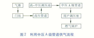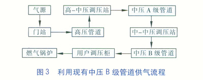 為改造后燃?xì)夤徨仩t房(大多數(shù)為中小型燃?xì)忮仩t房)供氣的中壓燃?xì)夤艿兰扔行陆?、現(xiàn)有中壓A級(jí)管道,又有現(xiàn)有中壓B級(jí)管道。中心城區(qū)現(xiàn)有中壓燃?xì)夤艿揽傞L度約1 377 km,其中設(shè)計(jì)壓力為0.15MPa的中壓B級(jí)管道約450km。新建中壓A級(jí)管道主要規(guī)格為DN 400~800mm,設(shè)計(jì)壓力為0.4MPa,新建中壓A級(jí)管道基本沿市政主干路網(wǎng)敷設(shè)。供熱規(guī)模較大的中型燃?xì)夤徨仩t房均由新建中壓A級(jí)管道供氣,供熱規(guī)模較小的小型燃?xì)夤徨仩t房由現(xiàn)狀中壓A級(jí)或中壓B級(jí)管道供氣。利用中壓A級(jí)管道的供氣流程見圖2。