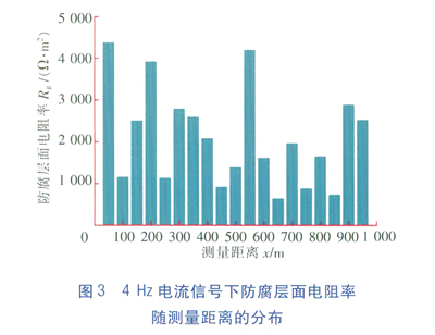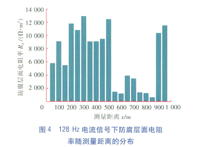 從圖3、4的測量結果來看,4Hz電流信號測量的結果,防腐層的質量較差,平均面電阻率為2106W·m2;128Hz電流信號測量的結果,防腐層的平均面電阻率為6926W·m2。